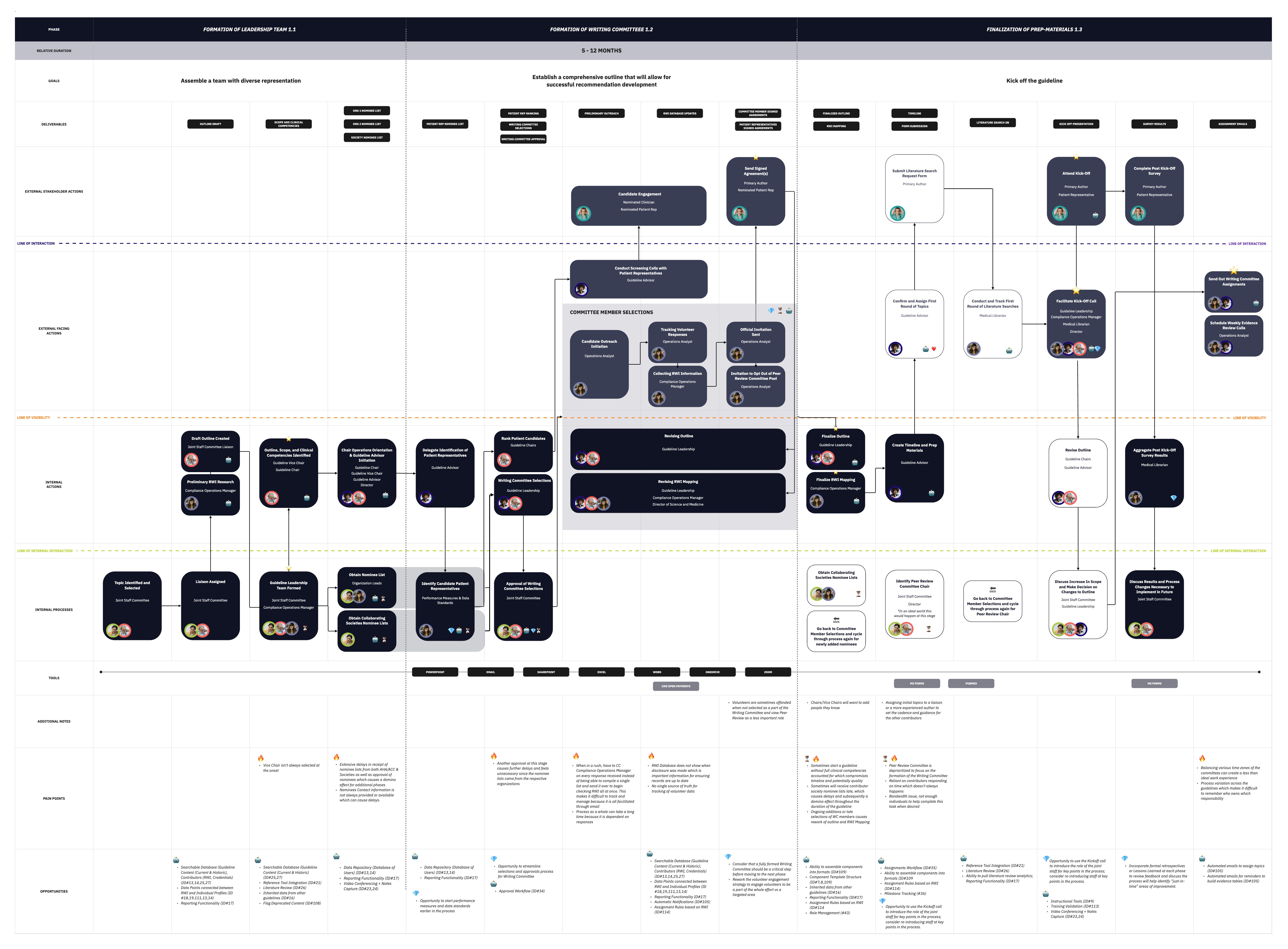 To untangle the intricacies of the clinical guideline development process, we started by creating an initial draft of the service blueprint based on insights from our interviews. This draft revealed a highly complex process with numerous moving parts and dependencies. Recognizing the importance of making this complexity approachable, we designed 4 separate blueprints representing distinctive phases of the process to balance depth with accessibility. This allowed stakeholders to understand the process without extensive explanation.